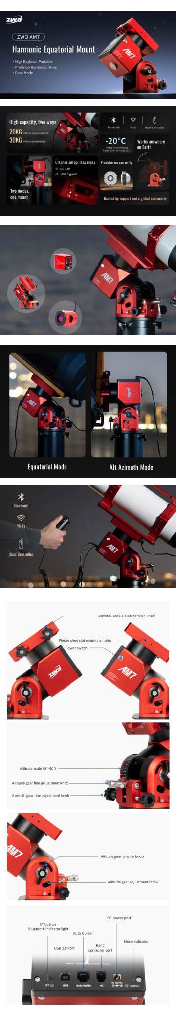 In piena filosofia ZWO, la montatura AM7N è progettata per integrarsi perfettamente in un'esperienza di astrofotografia intelligente e completamente wireless. La montatura è dotata di Wi-Fi e Bluetooth e può essere controllata senza cavi tramite l'app Sky Atlas per iOS e Android, oppure gestita direttamente tramite il computer ASIAIR di ZWO, per un flusso di lavoro moderno, semplice e completamente remoto oppure con piattaforma ASCOM, INDI e SkySafari. È incluso un controller con joystick, dotato di hotspot Wi-Fi integrato, che consente il controllo anche senza smartphone o computer. Per chi invece preferisce un approccio più tradizionale, la montatura può essere utilizzata anche senza smartphone o tablet, grazie alla pulsantiera manuale opzionale.