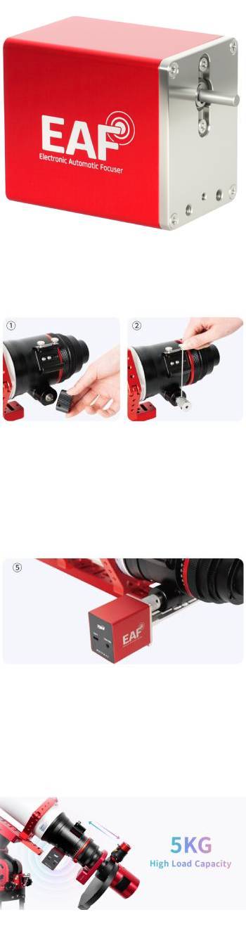 Il focheggiatore automatico elettronico EAF N (Electronic Auto Focuser) di Zwo Optical permette un controllo dinamico e di alta precisione micrometrica della messa a fuoco per immagini planetarie e deep-sky. La messa a fuoco può essere completamente automatizzata, anche in remoto oppure può essere utilizzata anche manualmente.