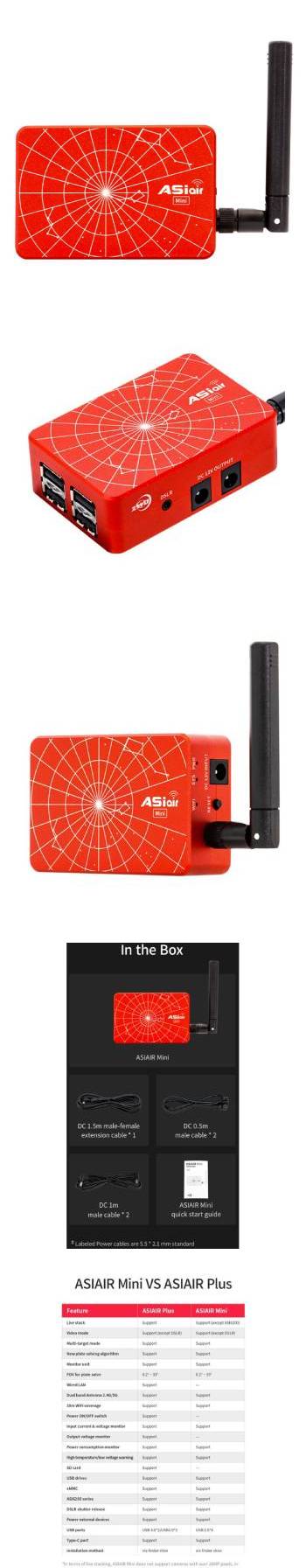 Il nuovo ASI AIR MINI è un dispositivo WiFi che permette di controllare tutte le camere ASI USB 2.0, USB 3.0. le ASI Mini, alcune fotocamere DSLR, nonchè le fotocamere mirrorless e quasi tutte le montature equatoriali per fare Plate Solving e Imaging direttamente tramite smartphone o tablet mentre è connesso in Wifi al sistema Asi Air.