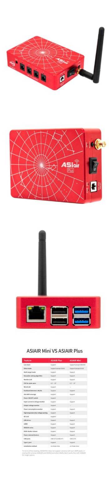 ASI AIR PLUS è un dispositivo WiFi che permette di controllare tutte le camere ASI USB 3.0. le ASI Mini, alcune fotocamere DSLR e quasi tutte le montature equatoriali per fare Plate Solving e Imaging direttamente tramite smartphone o tablet mentre è connesso in Wifi al sistema Asi Air.